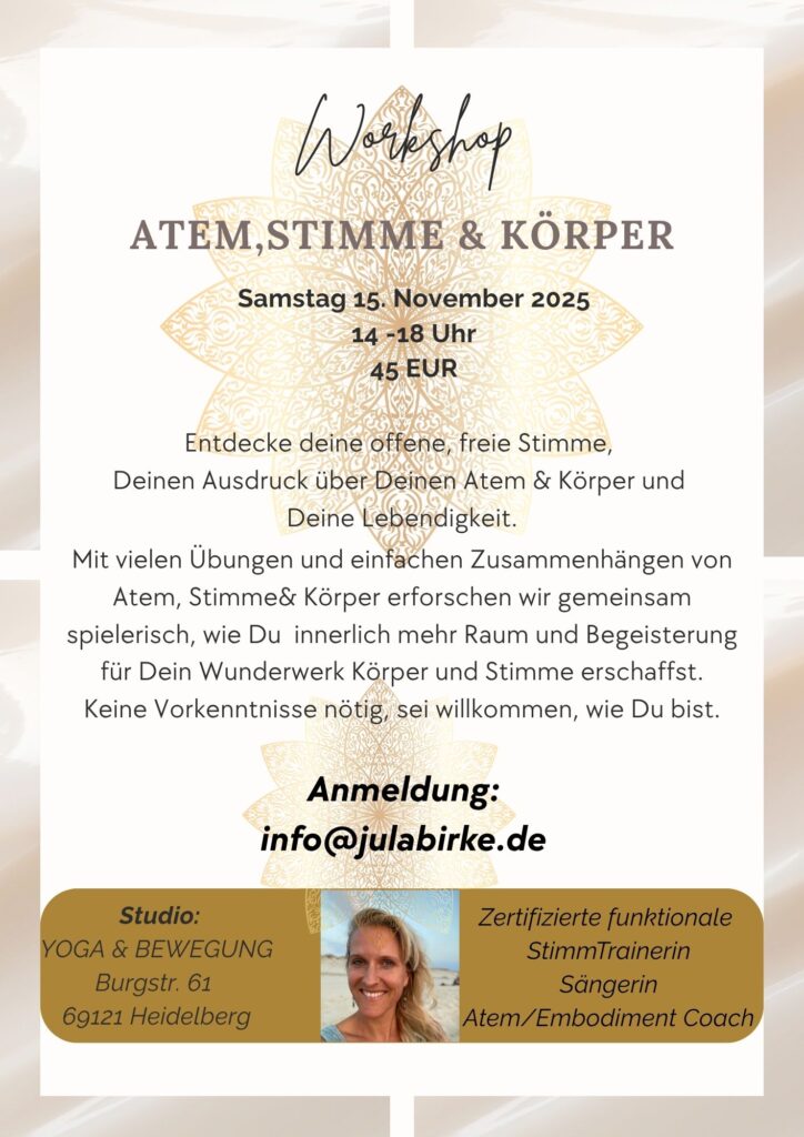 Mit Atem und Stimme erlaubst Du Dir so Zugang zu Räumen in Dir, welche lange verborgen waren, im Dornröschenschlaf – ganz konkrete Übungen mit Summen, Tönen und weit werden, Körperspannung/-entspannung helfen Dir, dich zu FÜHLEN. Mit allem, was da ist.